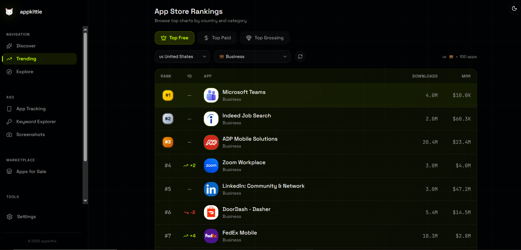 AppKittie is an App Store intelligence platform built specifically for founders and indie developers. Beyond revenue filters, it gives you download data, keyword intelligence, ASO suggestions, competitor ad creatives, and even influencer campaign tracking.