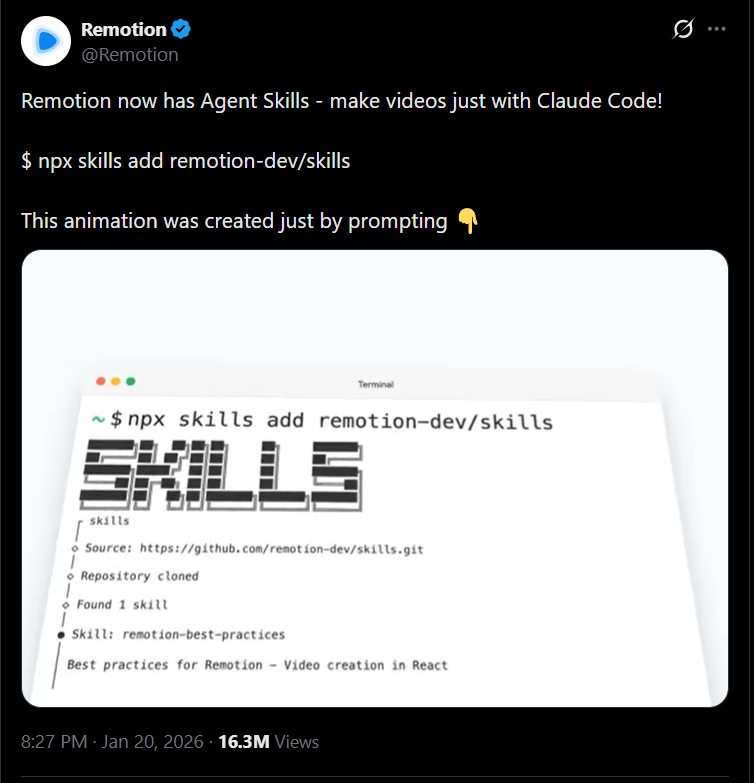 The number is not just impressive, it is telling. Most developer tools struggle to get adoption because the gap between "cool demo" and "practical output" is too large. Remotion's skill closed that gap fast.